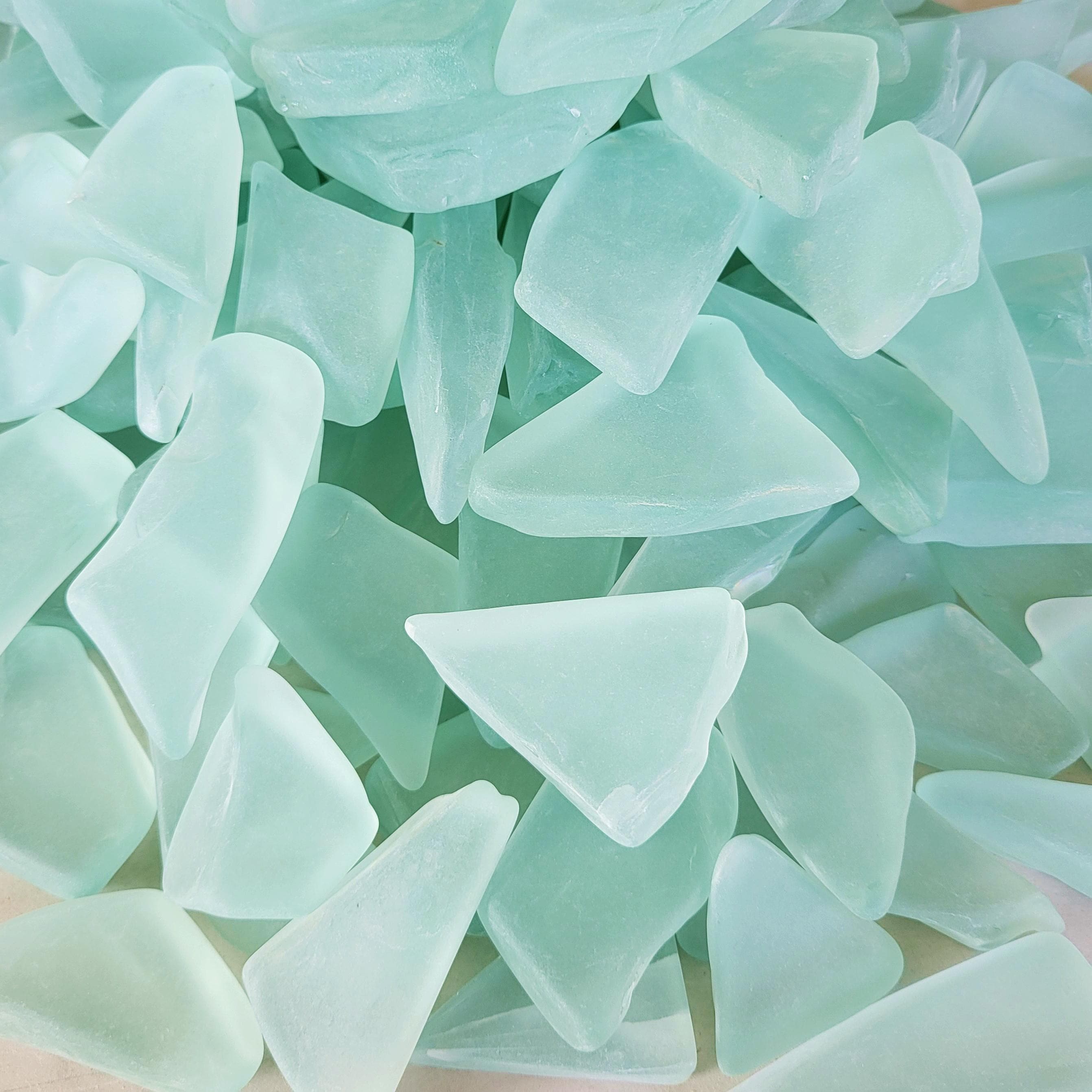 The smooth glass fragments in this listing have a frosted surface and a color I would describe as being a light shade of aquamarine. This versatile material could be used in an endless variety of projects and crafts. I have used this glass as vase filler, as a top dressing in planters and in an aquarium.